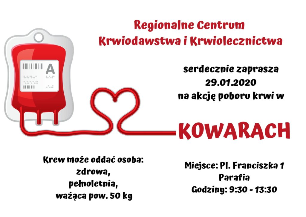 W imieniu Regionalnego Centrum Krwiodawstwa i Krwiolecznictwa w Wałbrzychu zapraszamy na kolejną akcję oddawania krwi, która odbędzie się 29 stycznia br. (w środę) w godz. 9:30 – 13:30 w Klasztorze oo. Franciszkanów w Kowarach (Plac Franciszkański 1).