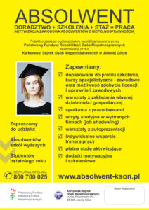 Zapraszamy do udziału w projekcie: „Doradztwo + szkolenia + staż = PRACA. Aktywizacja zawodowa absolwentów z niepełnosprawnością” współfinansowanego ze środków PFRON w ramach pilotażowego programu „Absolwent”.