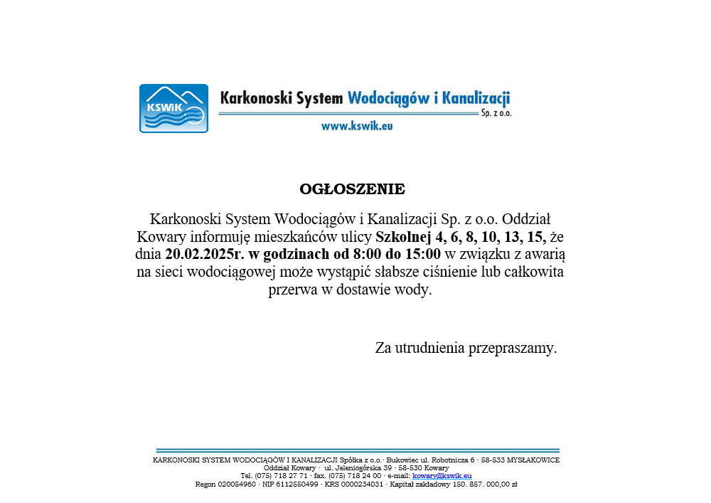 Karkonoski System Wodociągów i Kanalizacji Sp. z o.o. Oddział Kowary informuję mieszkańców ulicy Szkolnej 4, 6, 8, 10, 13, 15, że dnia 20.02.2025r. w godzinach od 8:00 do 15:00 w związku z awarią na sieci wodociągowej może wystąpić słabsze ciśnienie lub całkowita przerwa w dostawie wody.
