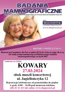 BADANIA MAMMOGRAFICZNE Data publikacji 28 lutego 202428 lutego 2024 by Mariusz Dmochowski Dnia 27 marca 2024 r. obok muszli koncertowej w Kowarach przeprowadzane będą bezpłatne badania mammograficzne dla kobiet w ramach Populacyjnego Programu Wczesnego Wykrywania Raka Piersi.