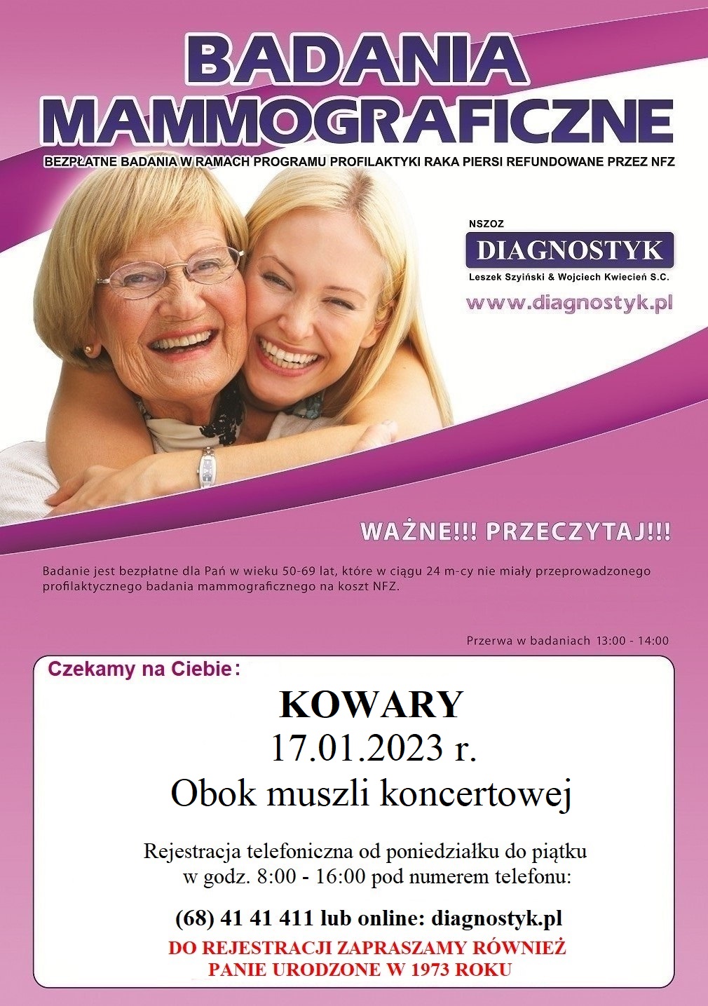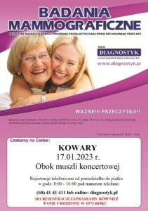 Bezpłatne badania mammograficzne – 17.01.2023r. Data publikacji 12 stycznia 202312 stycznia 2023 by Mariusz Dmochowski Dnia 17 stycznia 2023 r. obok muszli koncertowej przy ul. Jagiellończyka w Kowarach przeprowadzane będą bezpłatne badania mammograficzne dla kobiet w wieku od 50 do 69 lat. Serdecznie zapraszamy !!!
