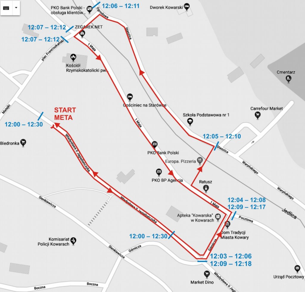 Informujemy, że w związku z organizacją imprezy Bieg “Tropem Wilczym” nastąpią utrudnienia w ruchu kołowym w centrum Kowar (mapa w załączniku posta). W godzinach 11:00 – 13:00 zostanie zamknięty fragment ulicy Władysława II Jagiellończyka, a w godz. 11:50 – 12:20 nastąpią utrudnienia na trasie biegu, tj. na ulicach: Wł. II Jagiellończyka, Górnicza, St. Staszica, Plac Franciszkański 1 Maja. Za utrudnienia przepraszamy i zachęcamy do udziału w naszym patriotyczno-sportowym święcie.