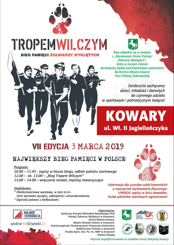 Serdecznie zachęcamy dzieci, młodzież i dorosłych do czynnego udziału w sportowym i patriotycznym święcie pn. Bieg „TROPEM WILCZYM”, który odbędzie się w Kowarach już w najbliższą niedzielę, tj. 3 marca 2019 r. Start biegu o godzinie 12:00. tradycyjnie przy ulicy Władysława II Jagiellończyka. Zapisy na miejscu imprezy od godziny 10:00. Bieg odbędzie się w związku z “Narodowym Dniem Pamięci Żołnierzy Wyklętych”, który w naszym mieście obchodzony będzie pod honorowym patronatem Burmistrza p. Elżbiety Zakrzewskiej.