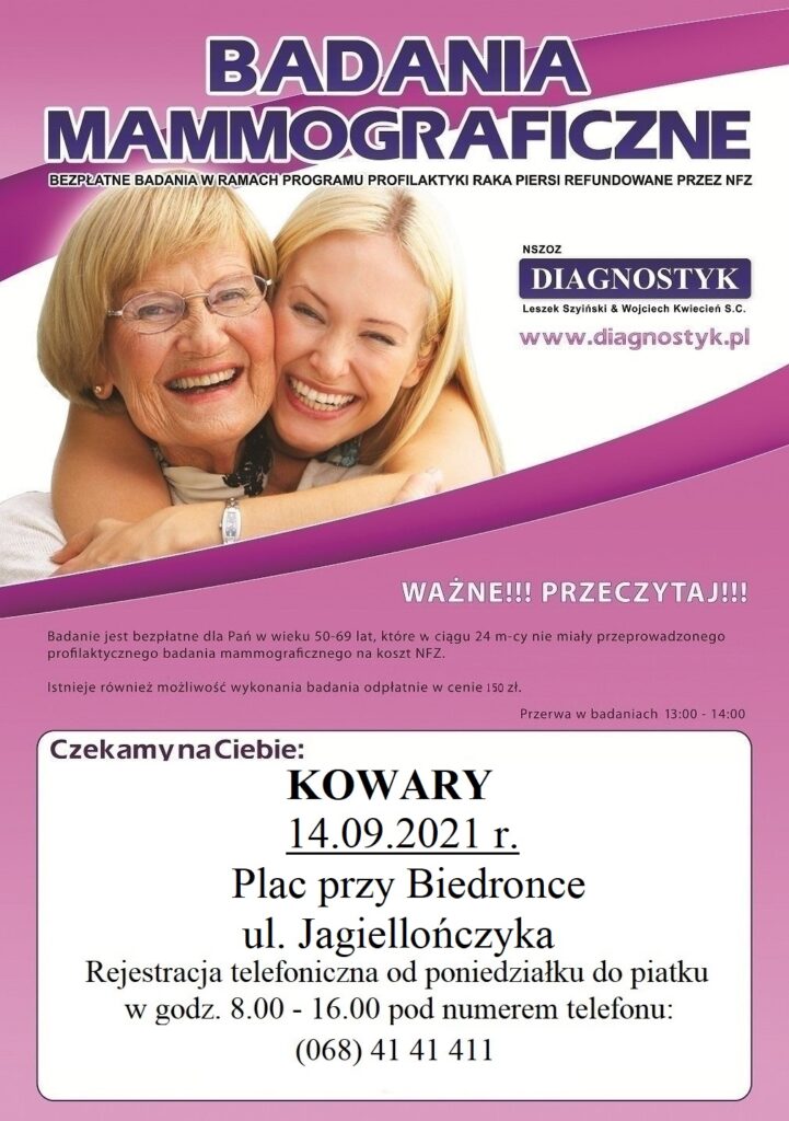 Dnia 14 września 2021 r. na Placu przy ul. Jagiellończyka przeprowadzane będą bezpłatne badania mammograficzne dla kobiet w wieku od 50 do 69 lat, które w ciągu ostatnich dwóch lat nie miały wykonywanych tego typu badań. Panie, które nie będą spełniały tych warunków będą mogły mieć wykonane badania odpłatnie w cenie 150 zł. Bardzo zależy nam na tym aby dotrzeć do mieszkanek urodzony w latach: 1969 r. – 1971 r. – te Panie mogą już wykonać badanie w ramach Populacyjnego Programu Wczesnego Wykrywania Raka Piersi.