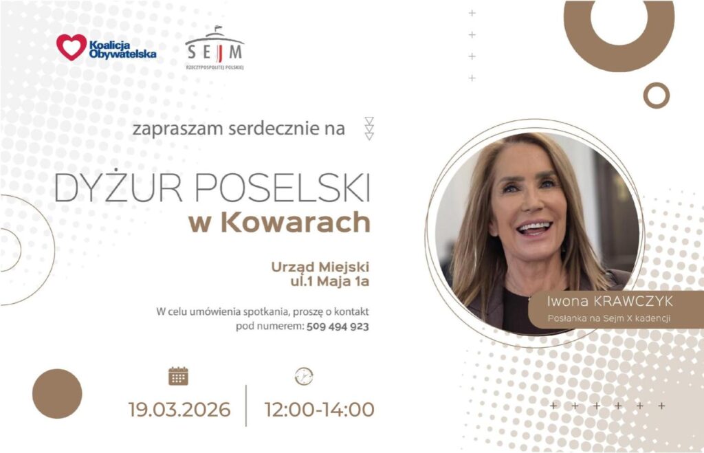 Dyżur poselski – 19.03.2026 r. Data publikacji 13 marca 202613 marca 2026 by Mariusz Dmochowski Zapraszamy na dyżur poselski z Panią Poseł Iwoną Krawczyk Dyżur odbędzie się w dniu 19.03.2026r. w godz. od 12.00 do 14.00 w Urzędzie Miejskim w Kowarach (budynek RATUSZA), sala konferencyjna na I piętrze.
