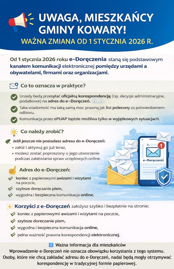 – Urzędy będą przesyłać oficjalną korespondencję (np. decyzje administracyjne, podatkowe) na adres do e‑Doręczeń.