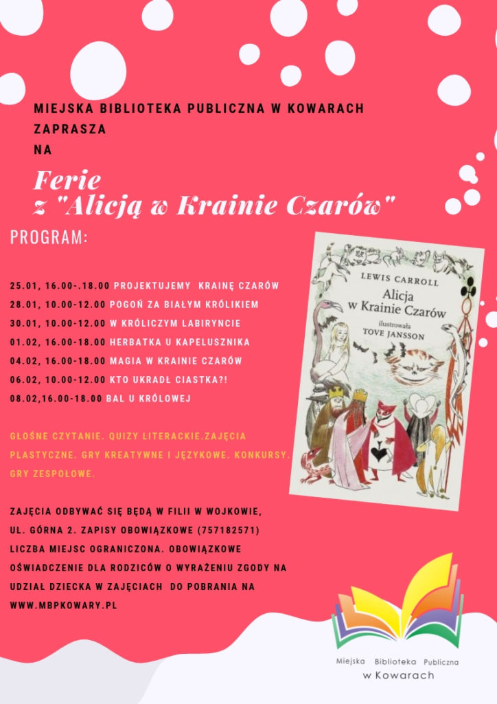 25.01 piątek, 16.00-18.00 – Projektujemy własną Krainę Czarów. Zajęcia plastyczne podczas, których będziemy robić dekoracje biblioteki inspirując się książką „Alicja w Krainie Czarów”.