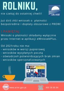Od bieżącego roku Agencja Restrukturyzacji i Modernizacji Rolnictwa przyjmuje wnioski jedynie za pośrednictwem aplikacji eWniosekPlus. Oznacza to, że do rolników nie będą wysyłane spersonalizowane wnioski papierowe. Nie będzie także możliwości składania oświadczeń o braku zmian w stosunku do roku ubiegłego.