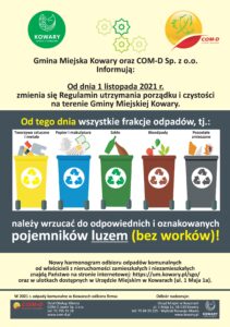 Gmina Miejska Kowary oraz firma Com-d informują, iż od 1 listopada w związku ze zmianą Regulaminu utrzymania czystości i porządku na terenie Gminy Miejskiej Kowary wszystkie frakcje odpadów komunalnych t.j. tworzywa sztuczne i metale, papier i makulatura, szkło, bioodpady oraz odpady zmieszane należy wrzucać do odpowiednich i oznakowanych pojemników luzem (bez worków).
