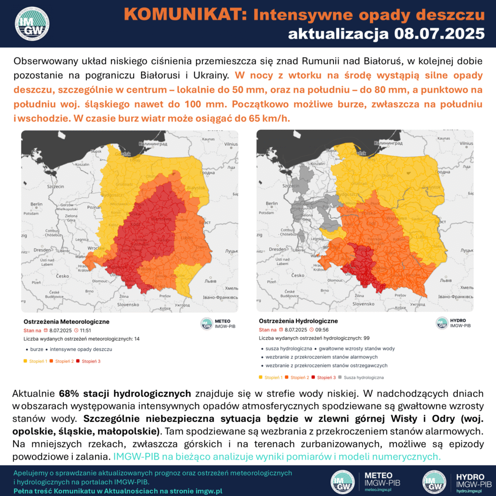 Podajemy komunikat Instytut Meteorologii i Gospodarki Wodnej – IMGW PIB o aktualnej i prognozowanej sytuacji meteorologicznej i hydrologicznej w kraju z dnia 08.07.2025 z godz. 12:00.