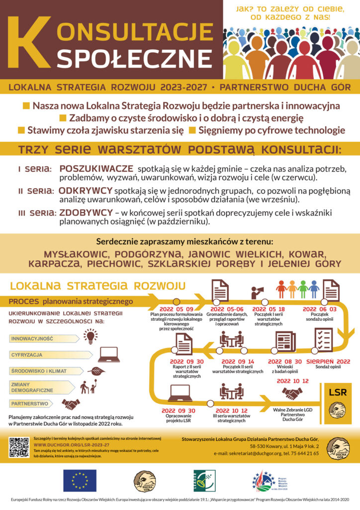 • Zapraszamy mieszkańców Kowar, do udziału w konsultacjach dotyczących tworzenia nowej Lokalnej Strategii Rozwoju na lata 2023-2027. Kowary 24.05.2022 Miejski Ośrodek Kultury, ul. Szkolna 2