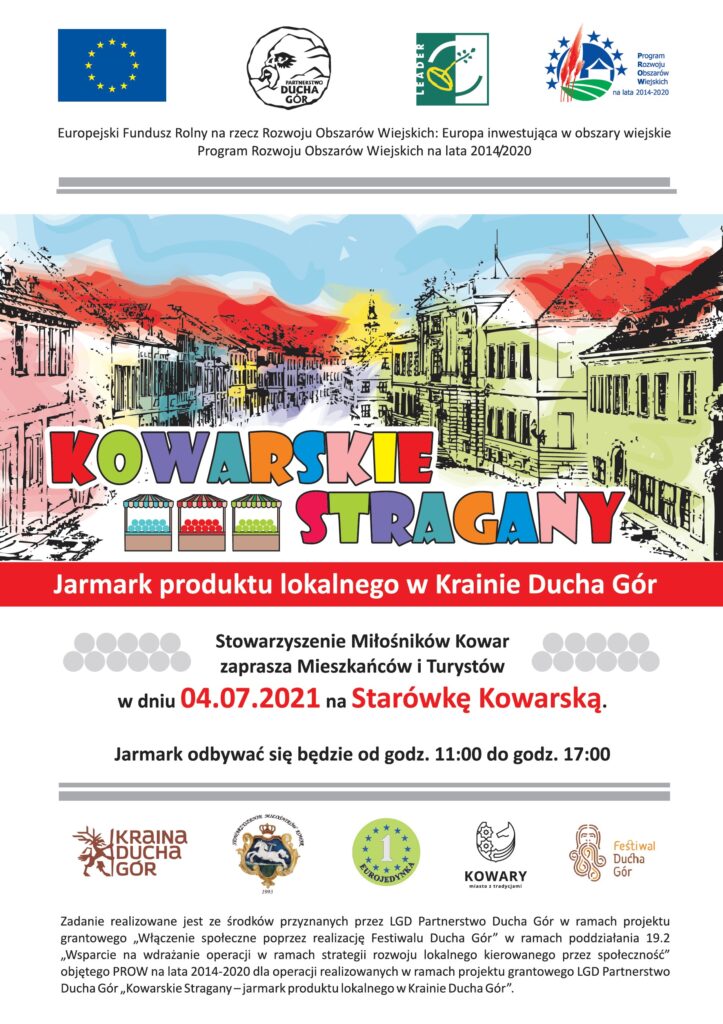 Już niebawem – 04 lipca zapraszamy Mieszkańców Kowar i Turystów na pierwszy Jarmark odbywający się w ramach projektu „Kowarskie Stragany- jarmark produktu lokalnego w Krainie Ducha Gór” organizowanego w ramach Festiwalu Ducha Gór na obszarze LSR