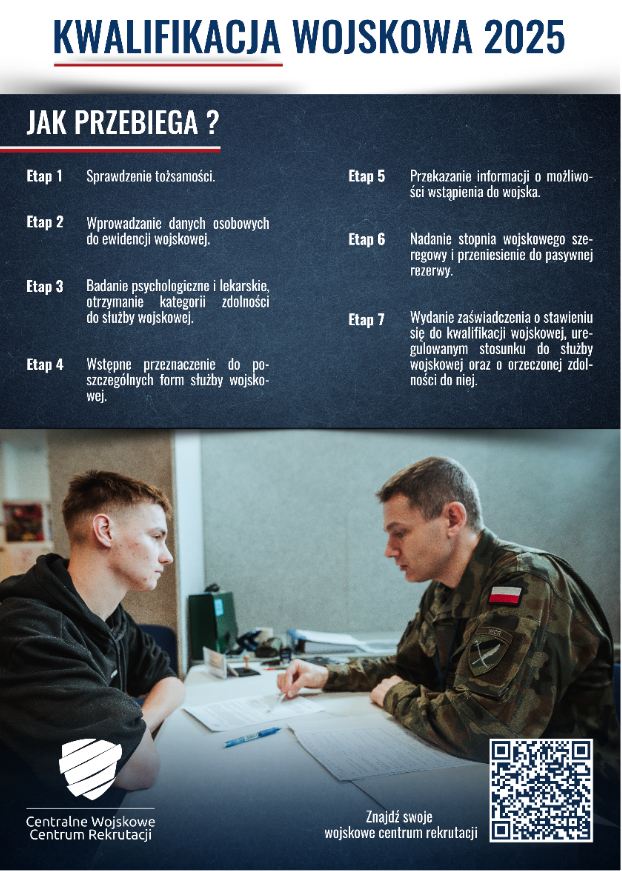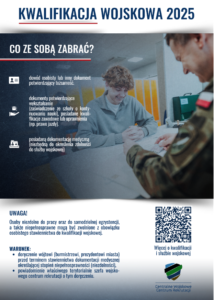 Przypominamy, że w dniach od 4 marca 2025 r. do 4 kwietnia 2025 r. przeprowadzona zostanie kwalifikacja wojskowa dla osób z terenu powiatu karkonoskiego oraz miasta Jelenia Góra.