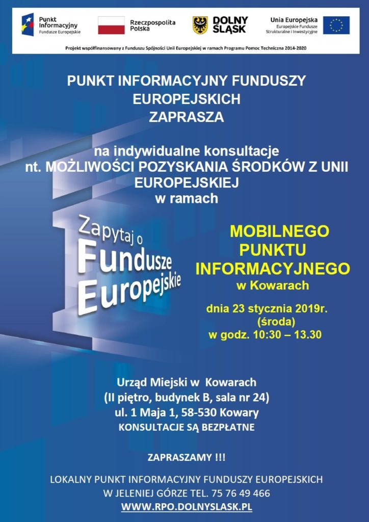 Punkt Informacyjny Funduszy Europejskich w Jeleniej Górze zaprasza do Kowar w dniu 23.01.2019r. w godzinach 10:30-13:30 do skorzystania z bezpłatnych konsultacji na temat wsparcia ze środków Funduszy Europejskich.