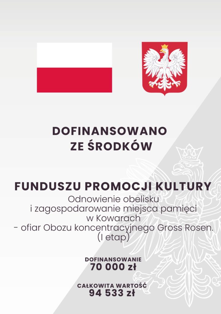 Informujemy, że projekt Gminy Miejskiej Kowary pn. “Odnowienie obelisku i zagospodarowanie miejsca pamięci w Kowarach – ofiar Obozu koncentracyjnego Gross Rosen. (I etap)”, zyskał dofinansowanie ze środków Ministra Kultury i Dziedzictwa Narodowego pochodzących z Funduszu Promocji Kultury (państwowego funduszu celowego).