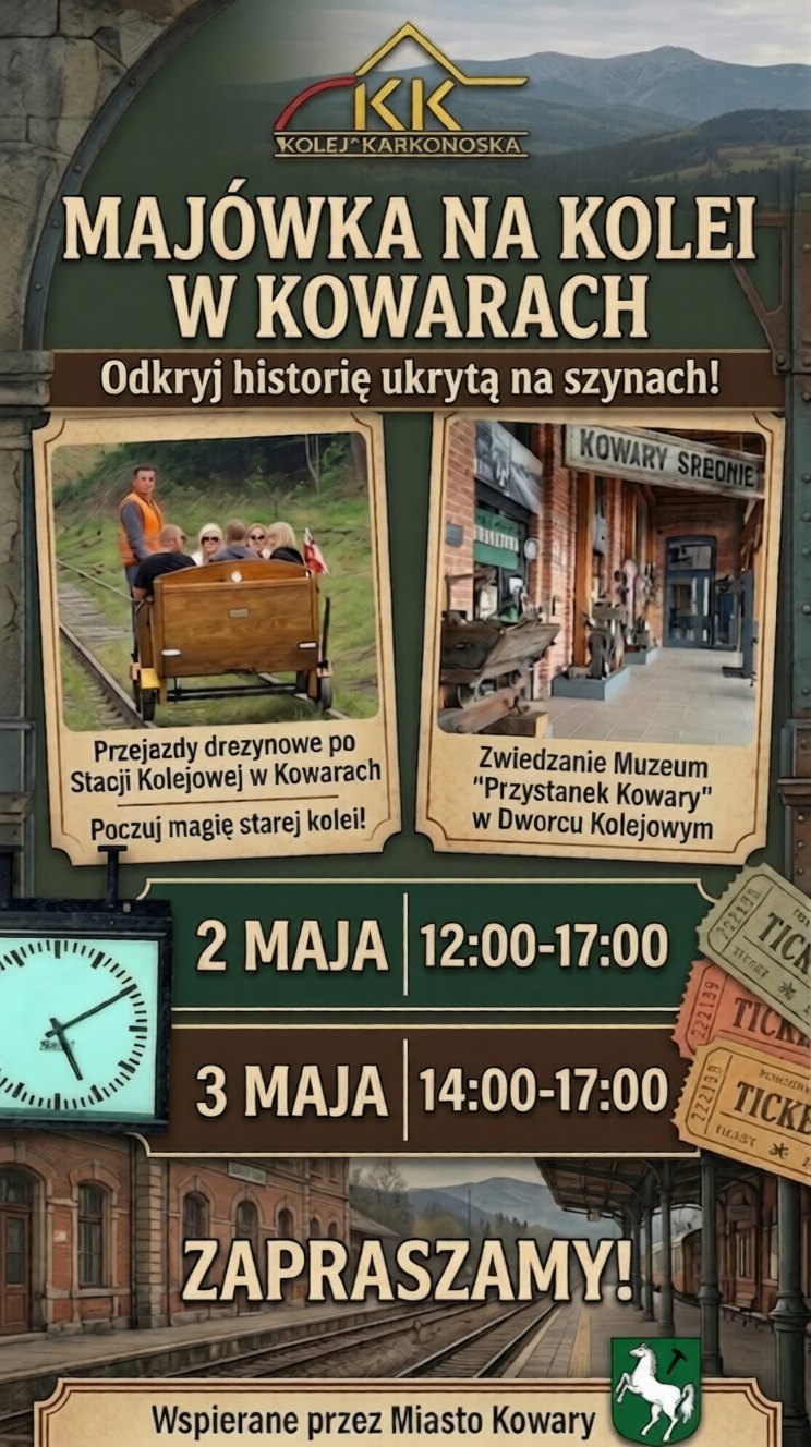 Przez całą majówkę (w godzinach 8:00-16:00) zapraszamy również do bezpłatnego muzeum “Przystanek Kowary”, zlokalizowanego przy Informacji Turystycznej (ul. Dworcowa 😎. Zaraz po przejażdżce drezynami zajrzyjcie koniecznie do nas, by zobaczyć świeżo otwartą wystawę poświęconą historii Kowar, w tym historii pociągów w Kowarach. 🚂