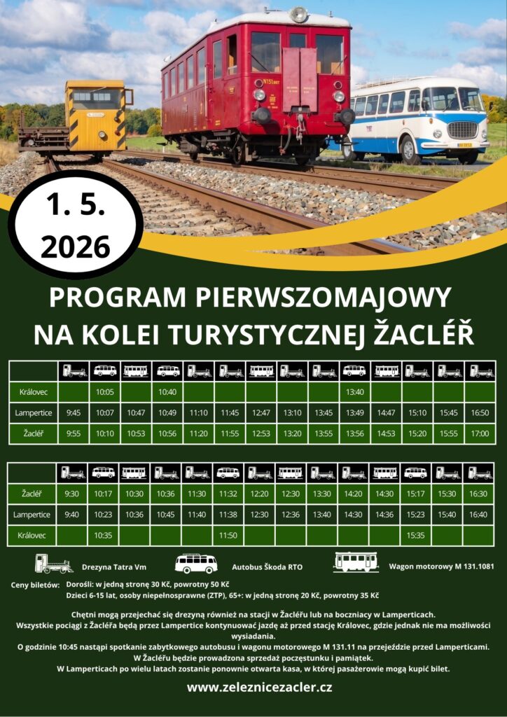1️⃣ MAJA – w naszym partnerskim Město Žacléř odbędą się turystyczne przejazdy Turistická železnice Žacléř na trasie do Královca i z powrotem. Rozkłady i szczegóły znajdziecie na załączonym plakacie.
