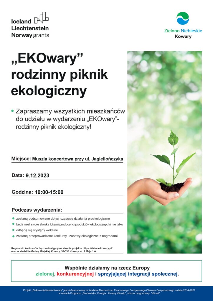 Od godziny 10:00 do 15:00 czekać będą na Państwa konkursy i zabawy ekologiczne z nagrodami oraz występy muzyczne. Podsumowane zostaną dotychczasowe działania w projekcie Zielono-niebieskie Kowary”. Czekać na Państwa będą również lokalni wystawcy z eko-produktami oraz ozdobami bożonarodzeniowymi.