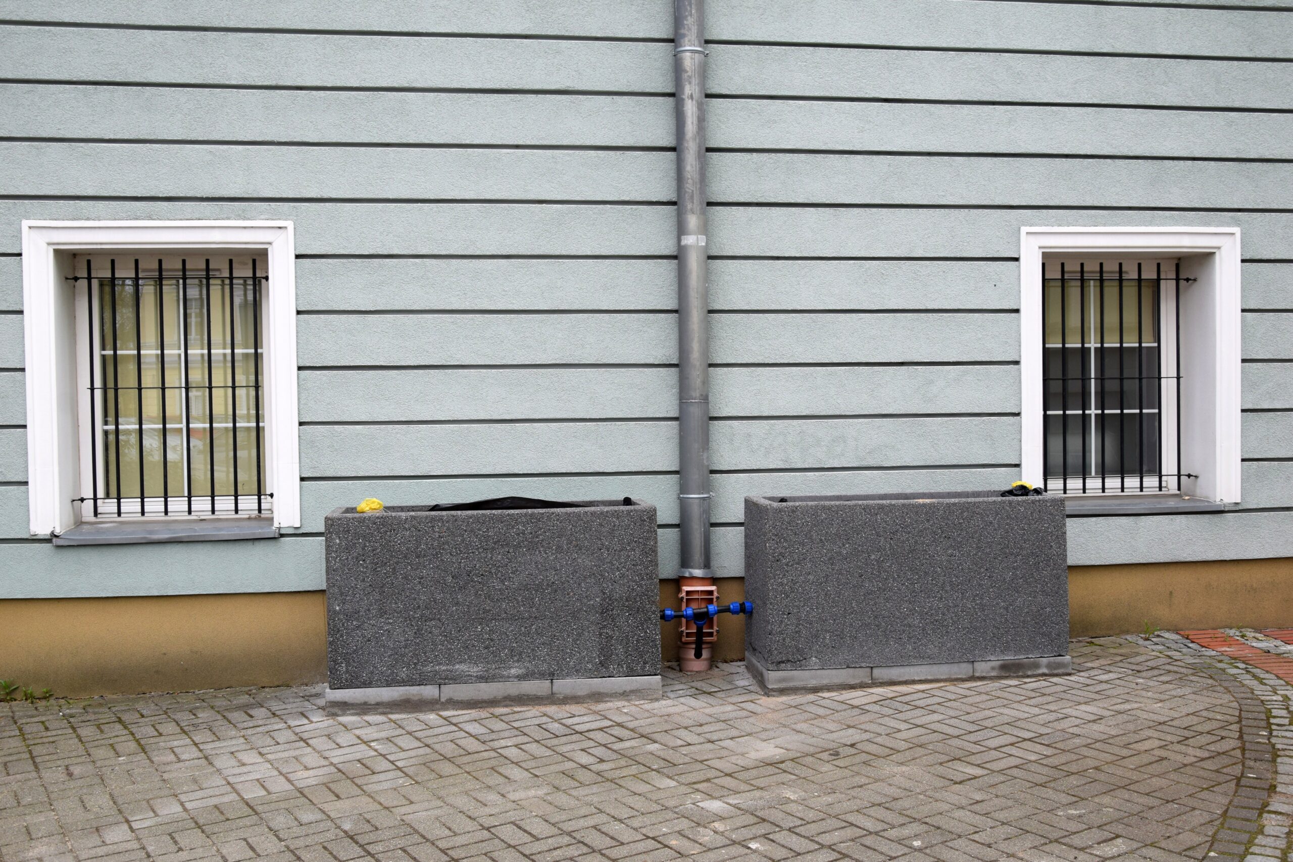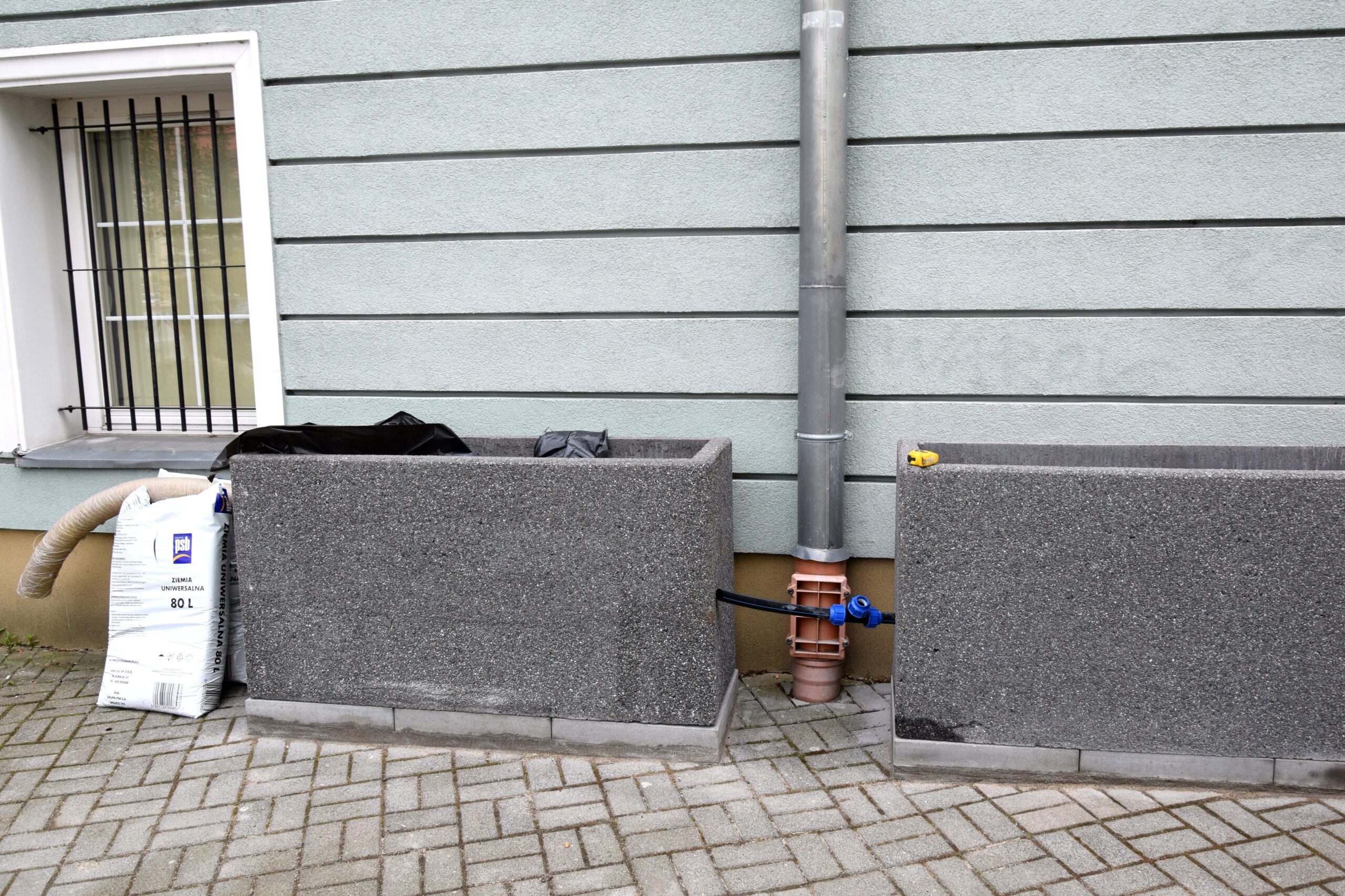 Ogród deszczowy – Pojemnik o charakterze przepływowym wykonany ze ścian betonowych, w technologii betonu płukanego w kolorze szarym o wymiarach 150 x 50 x 80 cm, wypełniony odpowiednimi warstwami przepuszczalnymi i ziemnymi do nasadzeń typu: żwir, piasek gruboziarnisty z dodatkami, folia PCV, posiadający podłączenie rurowe zasilające z rynny oraz odprowadzające nadmiar wody z pojemnika do kanalizacji deszczowej lub w przypadku terenów nieutwardzonych – do tzw. złoża chłonnego. Ogrody zostaną obsadzone roślinami takimi jak: turzyce, miecznica wąskolistna, sit, krwawnica pospolita, kosaćce, rdest wężownik i inne.