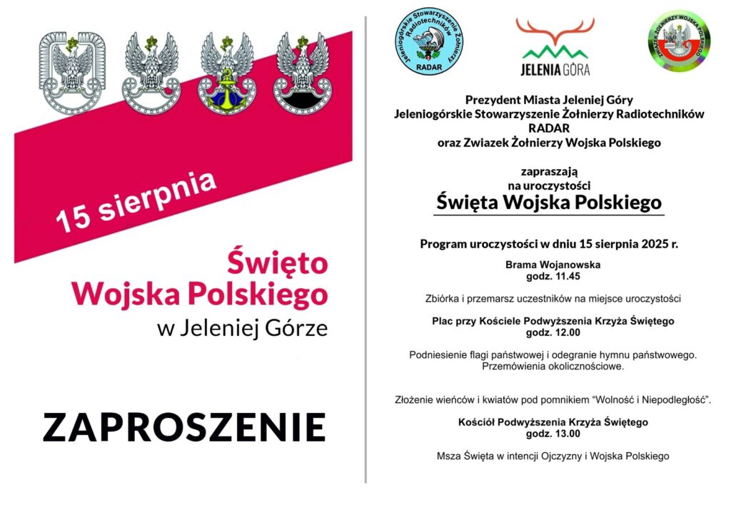 Uroczystości Święta Wojska Polskiego Data publikacji 12 sierpnia 2025 by Andrzej Weinke Informujemy, że 15 sierpnia 2025 r. w Jeleniej Górze odbędą się uroczystości Święta Wojska Polskiego. Początek tego wydarzenia: godzina 11:45. Pełen program uroczystości znajdziecie na załączonym zaproszeniu.