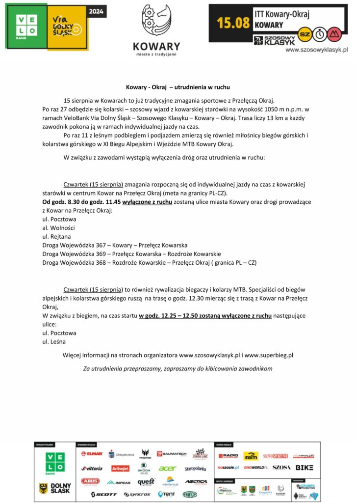 Jak co roku w związku z organizacją Szosowy Klasyk Kowary – Okraj – ITT i Kowary – Okraj – XI Bieg Alpejski i Wjazd MTB nastąpią w dniu 15 sierpnia 2024 r. (w czwartek) utrudnienia w ruchu. Planując w najbliższy wtorek wyjazd z Kowar w godzinach przedpołudniowych, szczególnie w kierunku granicy z Czeską Republiką, weźcie te utrudnienia w ruchu pod uwagę.