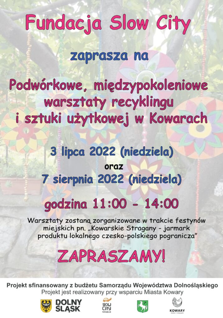 Wraz z kowarską Fundacją Slow City zapraszamy w dniu 3 lipca oraz 7 sierpnia 2022 r. (niedziele) na warsztaty recyklingu, które odbędą się na Kowarskiej Starówce w godz. 11:00 – 14:00.
