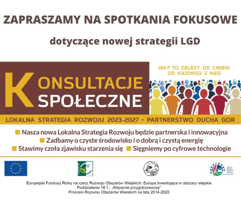 LGD Partnerstwo Ducha Gór zaprasza do udziału w spotkaniach fokusowych dot. nowej Strategii LSR na lata 2023-2027. Spotkania dotyczyć będą min. celów, wizji i przyszłych działań zapisanych w/w strategii, służących rozwojowi całego obszaru LGD (gminy: Kowary, Karpacz, Mysłakowice, Janowice Wielkie, Szklarska Poręba, Piechowice, Podgórzyn, Jelenia Góra).