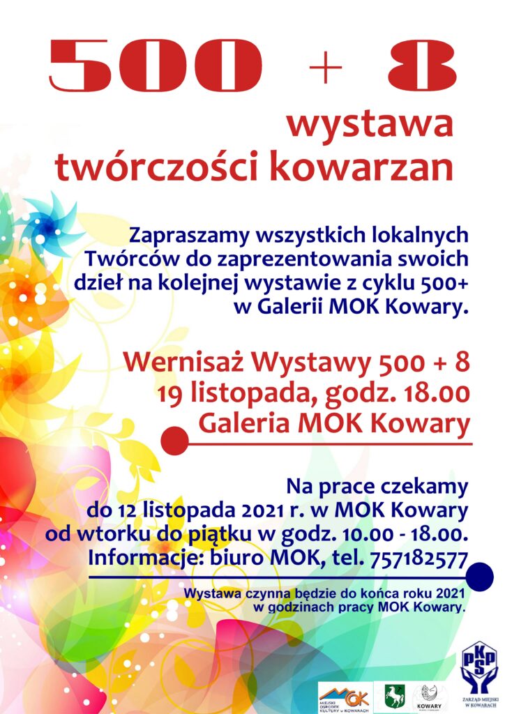 Miejski Ośrodek Kultury w Kowarach oraz PKPS Kowary zachęca do udziału w wystawie twórczości kowarzan pt. “500 + 8”. Jeżeli tworzycie coś ciekawego w swoim domowym zaciszu, możecie to pokazać innym. Wyjdźcie z ukrycia, pokażcie światu swoje prace. Własnoręcznie stworzone dzieła możecie podrzucać do kowarskiego MOK-u do 12 listopada br. Trafią one na wystawę, której wernisaż odbędzie się 19.11.2021 r.