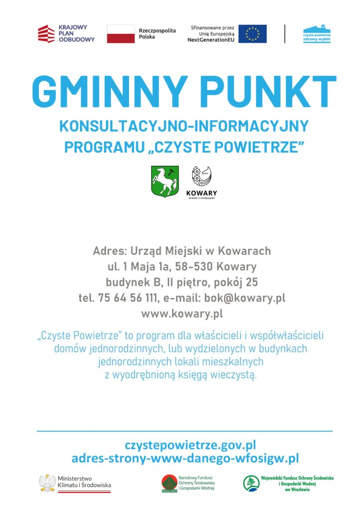 Więcej o Programie “Czyste Powietrze można znaleźć na stronach: https://czystepowietrze.gov.pl oraz https://um.kowary.pl/czyste-powietrze/