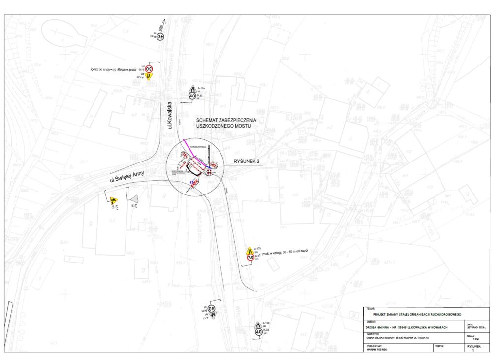 Informujemy, że w związku ze złym stanem technicznym mostu przy ulicy Kowalskiej (tym pod Kaplicznym Wzgórzem) wprowadzona zostanie nowa organizacja ruchu. Na drodze prowadzonej przez w/w most nastąpi zwężenie – jeden z pasów zostanie wyłączony z ruchu poprzez postawienie na nim ochronnej betonowej bariery. Zostanie również przesunięte przejście dla pieszych. Nowa organizacja ruchu w załączeniu. Prosimy o ostrożną jazdę oraz ostrożne przechodzenie przez most.